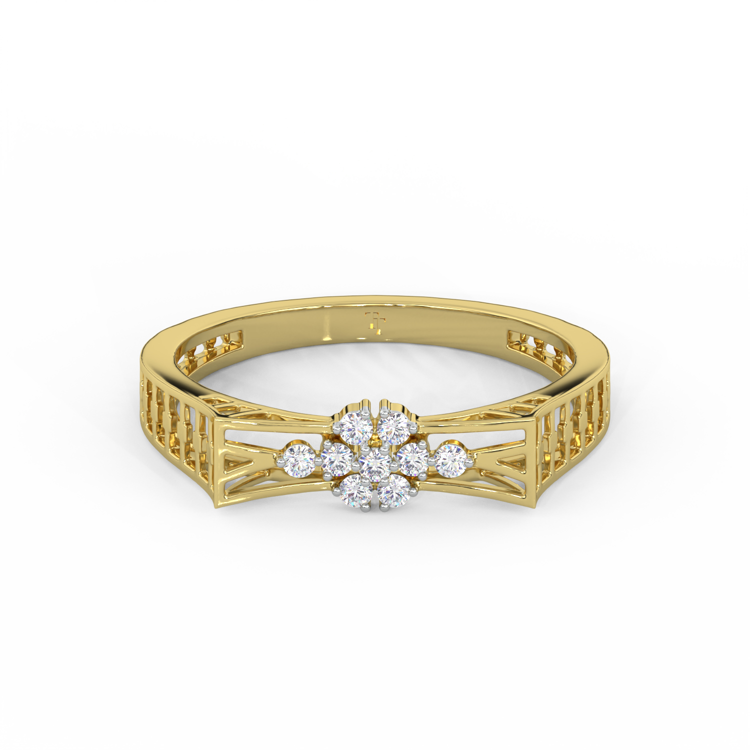 The Architectural Bloom Diamond Ring is a modern marvel, fusing structured design with feminine brilliance. Crafted in lustrous yellow gold, the wide band features a striking, contemporary design characterized by open-work vertical bars that create a geometric, airy feel on the shoulders. The central focus is a brilliant floral motif, formed by a cluster of closely set round diamonds that create the beautiful illusion of a single, large flower. Additional accent diamonds are set horizontally on either side of the cluster, drawing the eye toward the dazzling center. This elegant ring is perfect for the woman who appreciates structured symmetry combined with naturalistic sparkle.