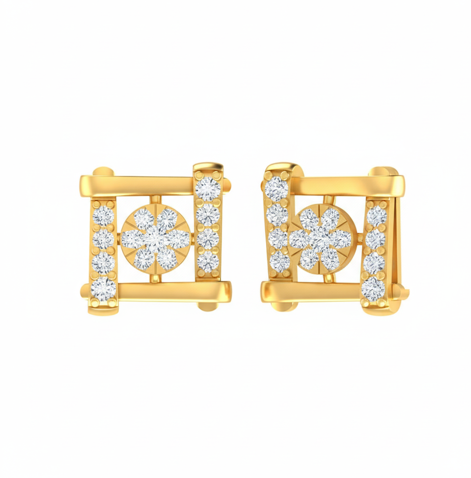 These striking stud earrings offer a unique fusion of modern architecture and brilliant femininity. They feature a bold, open square frame made of sleek bars of rose gold. Centered within this frame is a dazzling seven-stone diamond cluster arranged to resemble a beautiful flower, set in contrasting white metal to maximize sparkle. This central motif is flanked on either side by vertical bars of pave-set diamonds. The strong geometric lines of the rose gold frame provide a chic contrast to the soft floral diamond centerpiece, creating a sophisticated dual-tone design that is both contemporary and highly wearable.