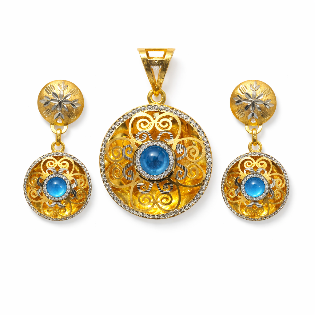 A stunning blue stone gold pendant set featuring intricate filigree patterns and a radiant round centerpiece. The elegant pendant is surrounded by delicate detailing and comes with matching drop earrings, creating a graceful and stylish jewellery set perfect for festive and special occasions.