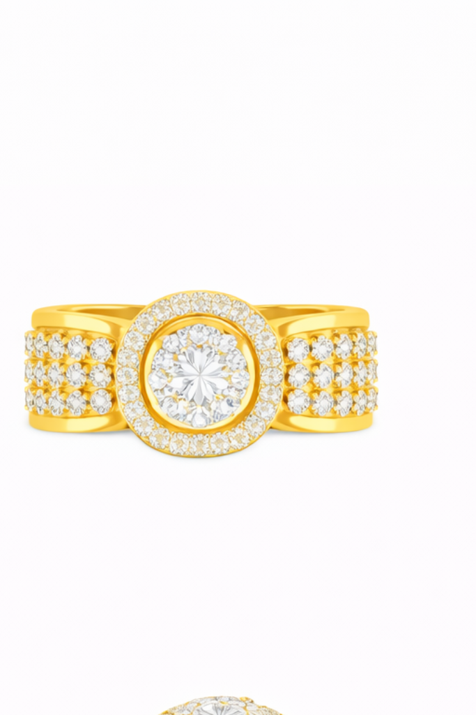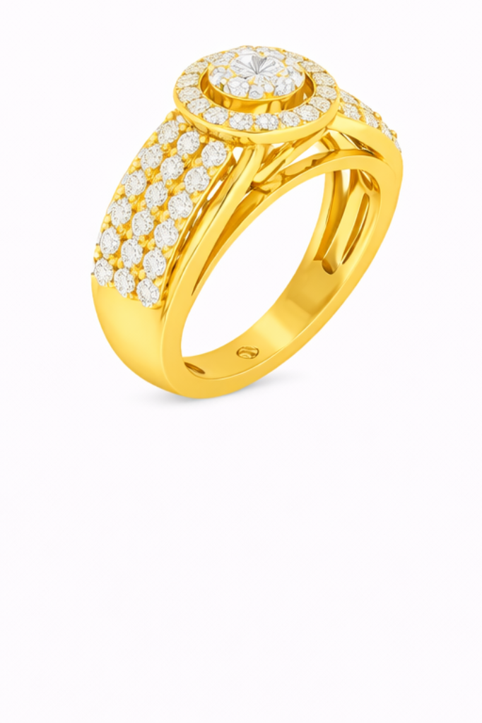 Gracefully designed to capture attention, this elegant diamond ring features a sparkling round cluster center surrounded by a delicate halo that enhances its brilliance. The beautifully crafted lattice-pattern band adds a touch of vintage charm while ensuring a light and comfortable feel. Accented with additional diamonds on the shoulders, this rose gold ring perfectly combines modern luxury with classic detailing, making it an ideal choice for special occasions or as a timeless addition to your diamond collection.