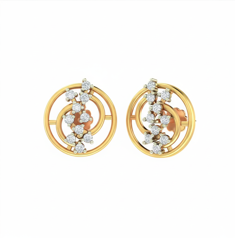 The Celestial Orbit Diamond Studs are a striking fusion of modern geometry and sparkling brilliance. Crafted in warm rose gold, each earring features a contemporary concentric circle or “orbit” design, creating an abstract, dynamic framework. Cutting across these sleek lines is a stunning, organic cluster of brilliant-cut diamonds that seem to float, adding an unexpected cascade of light and texture. This unique interplay between structured metal and glittering diamonds makes these studs an artistic statement piece, perfect for those who favor bold, modern jewelry.