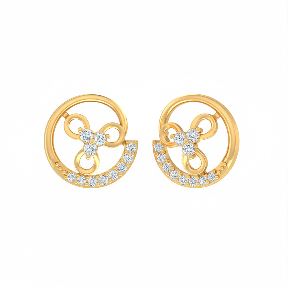 These imaginative stud earrings are a graceful blend of contemporary circular design and delicate floral elements. The main structure features a smooth, polished ring of warm rose gold. Within this frame, a stylized clover or three-petal diamond cluster forms the sparkling focal point. The lower half of the circle is beautifully adorned with a contrasting crescent of pave-set round diamonds (likely in white metal), adding brilliant light and texture. The interplay between the sleek, open metalwork, the feminine curves, and the dual-tone finish makes these studs a uniquely elegant accessory, perfect for adding refined sophistication to any look.