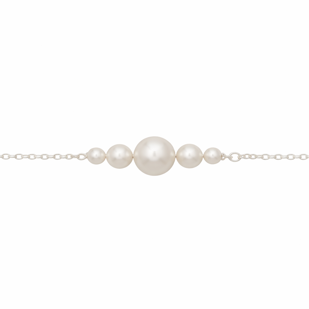 This elegant bracelet features a central arrangement of five lustrous white pearls, gracefully graduated in size for a timeless aesthetic. Set on a delicate sterling silver chain, the minimalist design highlights the natural beauty and symmetry of the pearls. Perfect for daily wear or special occasions, this piece adds a touch of sophistication to any outfit.
