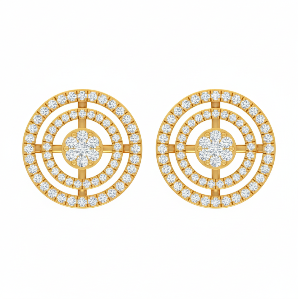 These magnificent Concentric Halo Diamond Studs are designed for maximum impact and brilliance. Crafted in a chic dual-tone combination of radiant White Gold and contrasting Rose Gold accents, the earrings feature a bold, circular design. At the center is a brilliant cluster of diamonds, encircled by two magnificent pavé-set diamond halos. The intricate setting is visually anchored by four subtle Rose Gold crosses that connect the inner and outer layers, adding a touch of geometric flair and structural elegance. These luxurious studs are perfect for those seeking a large, statement-making piece with exceptional sparkle for weddings or upscale events.