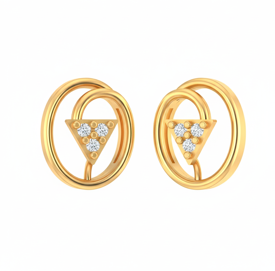 The Contemporary Orbit Diamond Stud Earrings are a striking piece of modern jewelry that celebrates geometric elegance and movement. These innovative studs feature a three-dimensional design, where a sleek, polished gold loop (the “orbit”) gracefully encircles an inner floating element. The centerpiece is a bold, inverted triangle set with a cluster of three shimmering brilliant-cut diamonds. The interplay between the smooth circular form and the sharp angular triangle, combined with the subtle sparkle of the diamonds, creates a dynamic and sophisticated look. These earrings are a perfect fit for the modern woman who loves minimalist, architectural designs.