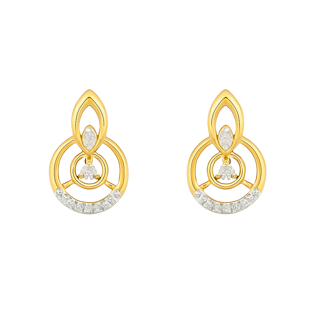These exquisite Diamond Interlink Drop Studs are a masterpiece of contemporary, layered design. Crafted in luminous yellow gold, the earring features a sweeping, central marquise-shaped loop holding a round and a marquise-cut diamond. This elegant element is framed by two concentric gold circles, the lower of which is beautifully accentuated with a delicate sweep of pave-set round diamonds. The combination of clean lines, geometric shapes, and brilliant diamonds makes this a sophisticated piece perfect for adding a touch of modern luxury to any occasion.