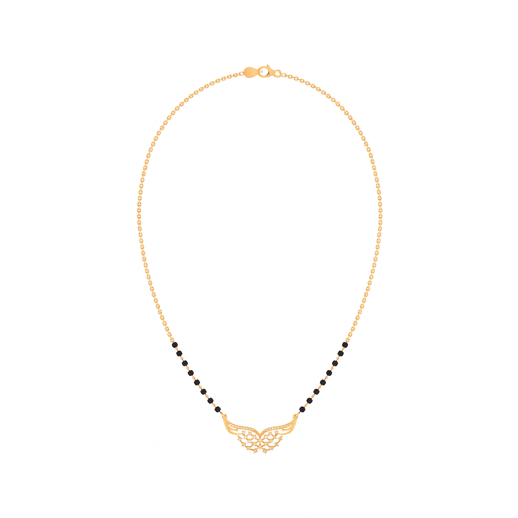 The Divine Wings Diamond Mangalsutra is a radiant symbol of love, protection, and new beginnings. Crafted in 18KT and 14KT gold, it features a delicate chain with traditional black beads and a striking pendant shaped like angelic wings, highlighted with sparkling diamonds. This graceful design blends spiritual elegance with modern sophistication, making it a timeless treasure for everyday wear.