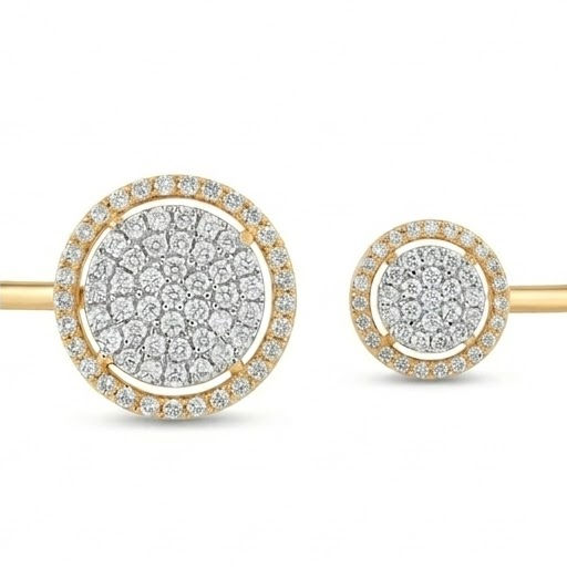The Dual Halo Diamond Open Kada is a stunning expression of modern luxury with a touch of classic brilliance. Crafted in fine gold, this elegant open bracelet features two circular diamond motifs of different sizes, creating a unique and stylish asymmetrical design. Each circle is beautifully studded with a cluster of sparkling diamonds at the center and surrounded by a shimmering halo, enhancing the overall brilliance. The sleek gold band keeps the look minimal yet premium, making it perfect for both daily elegance and special occasions.