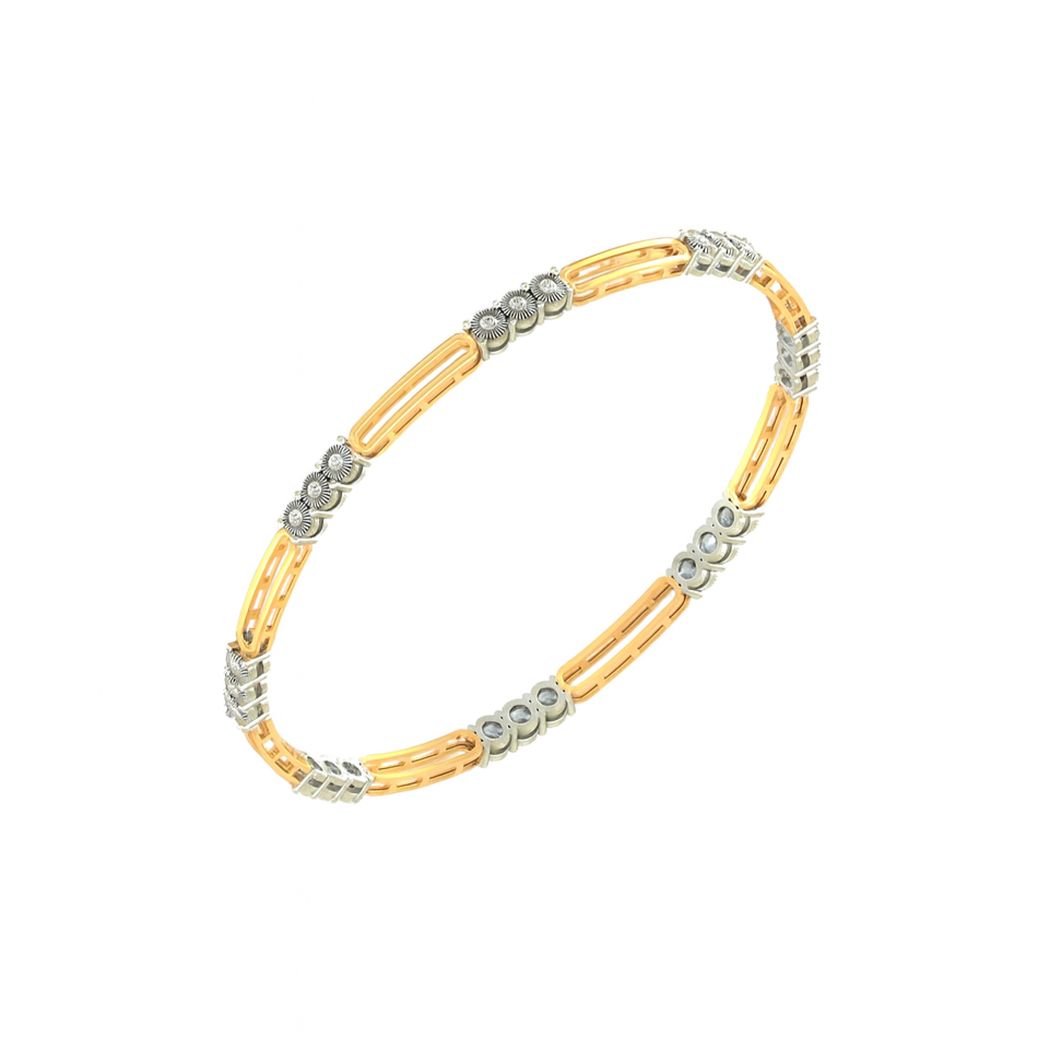 A perfect balance of modern artistry and timeless tradition, this dual-tone bangle blends rose gold and white gold with intricate diamond-studded accents. The alternating geometric motifs create a striking design, making it a versatile piece for both festive occasions and daily elegance.