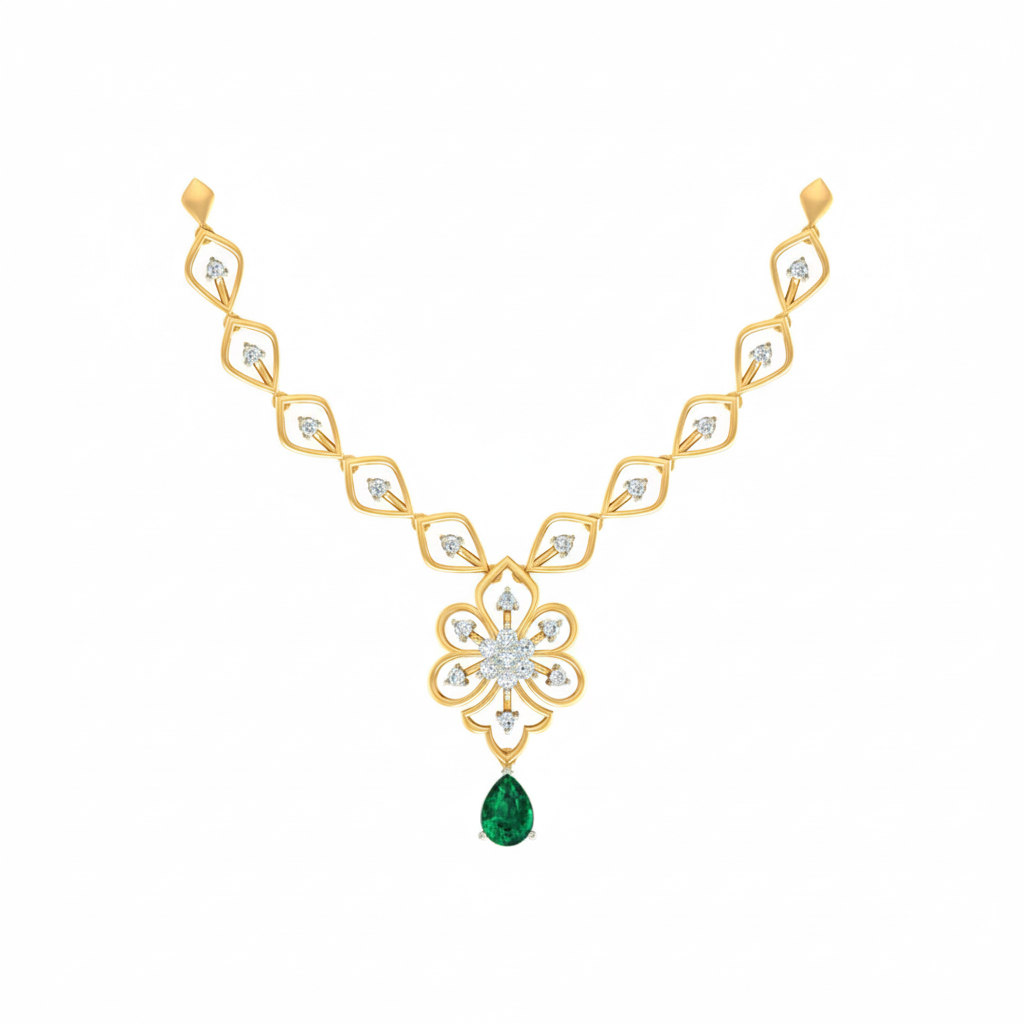 The Emerald Bloom Diamond Necklace is a captivating statement piece that celebrates natural elegance and luxury. Crafted in radiant Rose Gold, the chain is formed by a sequence of open marquise-shaped links, each graced with a brilliant diamond solitaire. The centerpiece is an intricate open-work floral motif set with dazzling diamonds, from which a majestic pear-cut, deep green emerald gracefully suspends. This necklace is an ideal choice for the woman who desires a sophisticated, color-rich accessory perfect for gala events, anniversaries, or wedding receptions.
