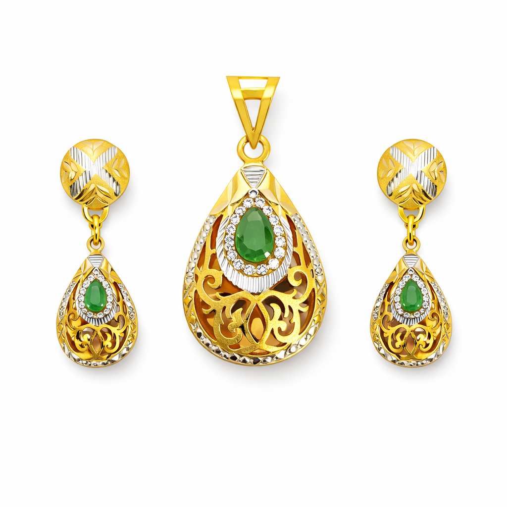 A graceful emerald teardrop gold pendant set featuring an elegant pear-shaped green stone surrounded by delicate detailing and sparkling accents. The intricate gold pattern adds a traditional charm, while the matching drop earrings complete the set, making it perfect for festive and special occasions.