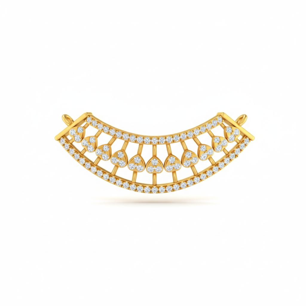 The Enchanting Heart Diamond Mangalsutra beautifully marries romantic design with modern sophistication. Crafted in a captivating rose gold finish (or your specified gold purity), this curved, arc-shaped pendant features a delicate lattice design. The focal points are a row of seven heart-shaped diamond clusters, suspended below a brilliant curve of round, pave-set diamonds. It’s an exquisite piece that symbolizes love and devotion while offering a contemporary, elegant look perfect for daily wear or special occasions.
