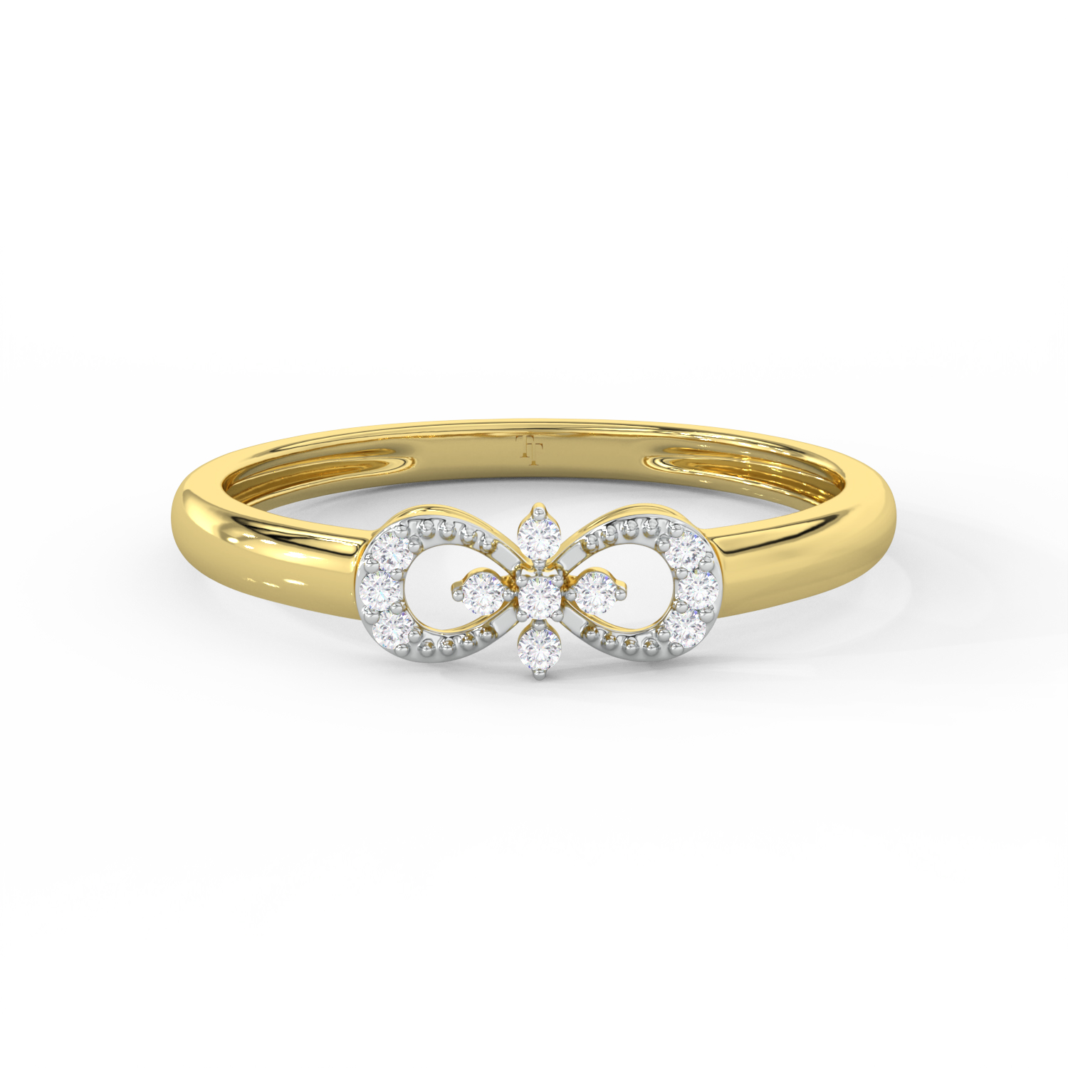 The Endless Flutter Diamond Ring is a beautiful piece symbolizing eternal connection and delicate beauty. Crafted in polished yellow gold, the slender band leads to a charming, stylized centerpiece that combines the shape of a dainty bow/butterfly with the symbol of infinity. The two loops of the motif are outlined with shimmering pavé-set diamonds in white gold accents, while a small cluster of diamonds at the center forms a miniature floral or butterfly body. Lightweight and comfortable, this ring is an elegant choice for daily wear, symbolizing enduring love and grace.