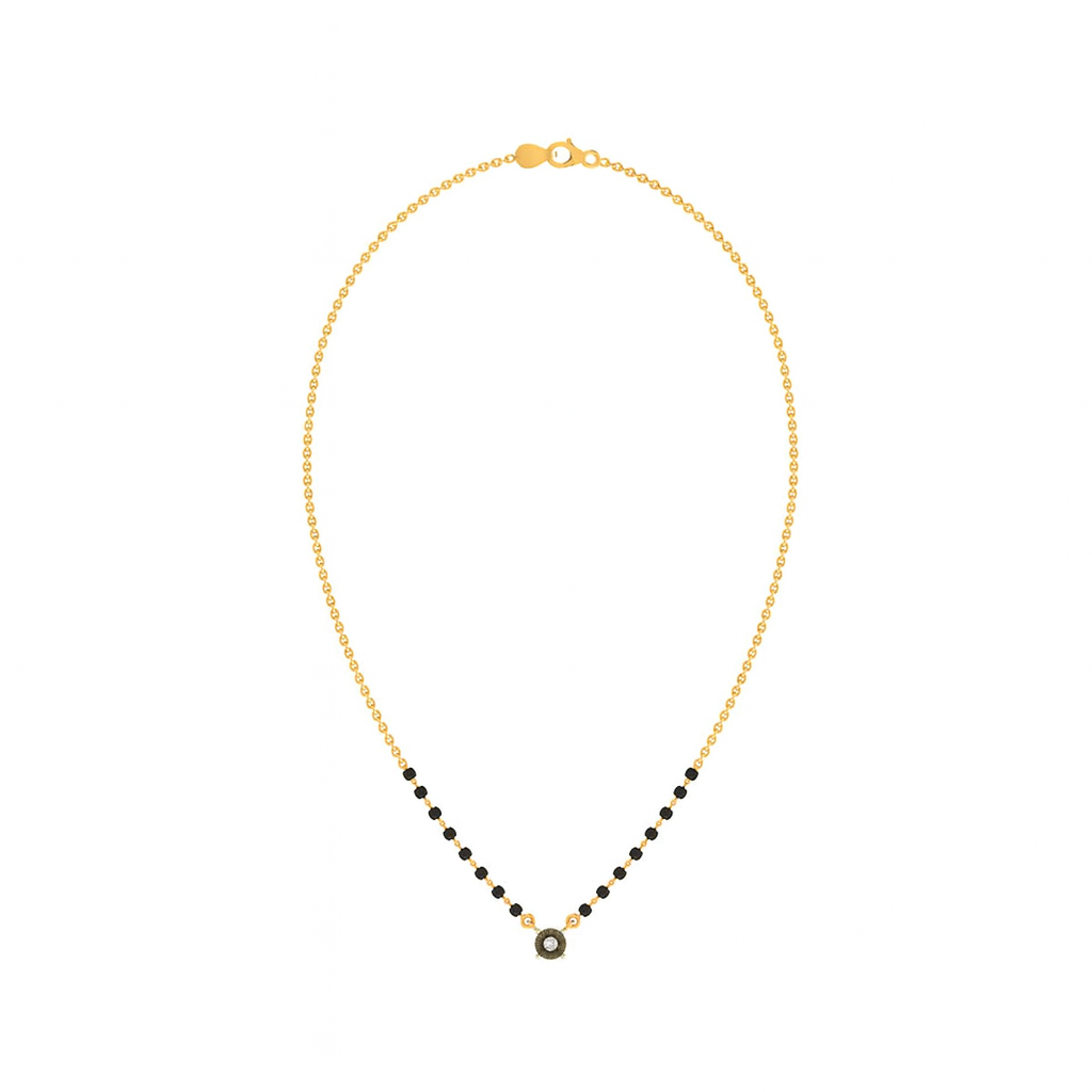 The Eternal Aura Diamond Mangalsutra is a classic yet modern symbol of everlasting love. Crafted in 18KT and 14KT gold, it features a sleek gold chain with traditional black beads and a minimalist round diamond pendant at the center. The simple yet elegant design makes it perfect for women who prefer understated sophistication for everyday wear.