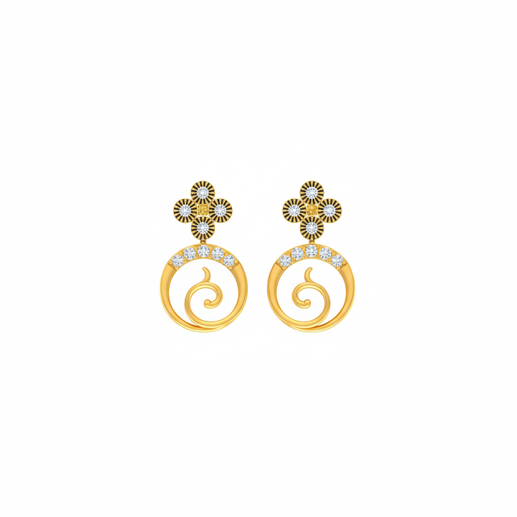 The Eternal Swirl Diamond Drop Earrings are a charming blend of floral inspiration and fluid motion. The top of the earring features a striking clover or quad-cluster diamond stud, elegantly framed in a dual-tone setting. Below this, a delicate link leads to a captivating open-circle drop defined by a graceful, rose-gold swirl. The curve of the swirl and the diamond-set base of the circle create a sense of continuous flow and light. These earrings are lightweight, versatile, and add a touch of playful sophistication to both casual and semi-formal ensembles.