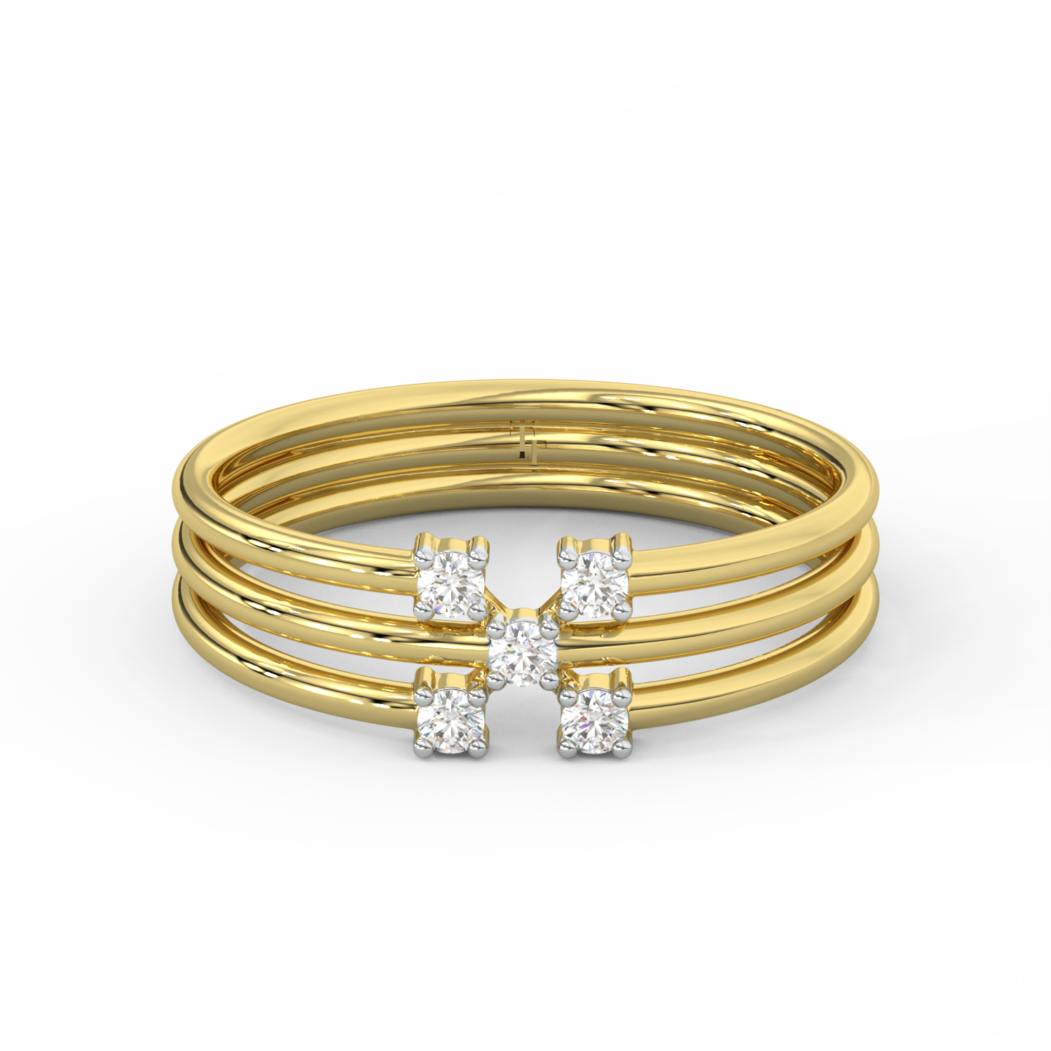 The Five-Stone Stacked Band Ring is a sleek and modern design that offers the look of multiple stacked rings in a single, comfortable piece. Crafted in polished yellow gold, it features four slender, interconnected bands. The focus is a striking geometric arrangement of five brilliant round diamonds, each held in a square-like prong setting. This arrangement forms a cross or flower pattern centered on the middle bands. The simplicity of the thin gold lines contrasted with the sparkle of the diamonds makes this ring a chic, contemporary choice perfect for elevating everyday style.