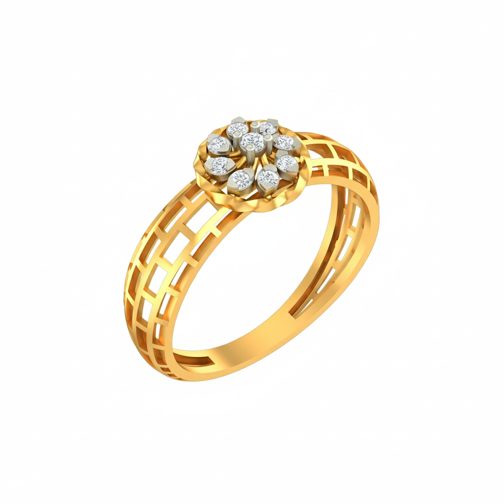 The Geometrik Bloom Diamond Ring is a perfect piece for the modern woman, blending classic brilliance with architectural design. Crafted in a rich rose-gold tone, the ring features a unique, open-work band with a stylish rectangular grid or lattice pattern. This contemporary band contrasts beautifully with the soft, feminine centerpiece: a dazzling diamond cluster set in a round, polished head that mimics a small flower. The design is airy yet substantial, offering a sophisticated statement that’s versatile enough for both professional settings and social events.