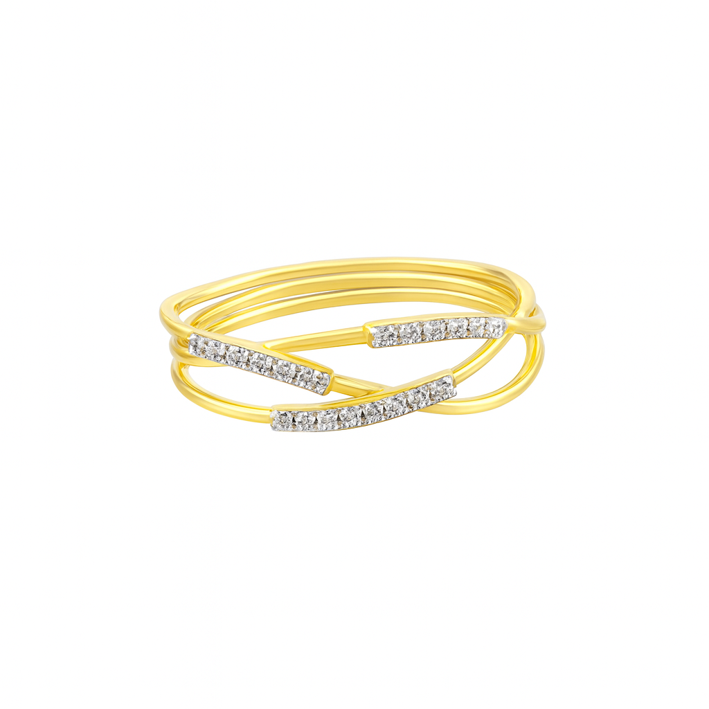 The Luminous Flow Diamond Ring is a striking piece that captures movement and modern style. Crafted in brilliant Yellow Gold, this ring features a contemporary wrap-around design with multiple delicate bands that elegantly intersect across the finger. Three of the crossing bands are meticulously set with shimmering round cut diamonds in a sleek bar arrangement, creating a continuous line of sparkle. Its open, airy structure makes it a comfortable yet impactful piece, perfect for those who favor bold, modern jewelry that can transition effortlessly from day to evening.
