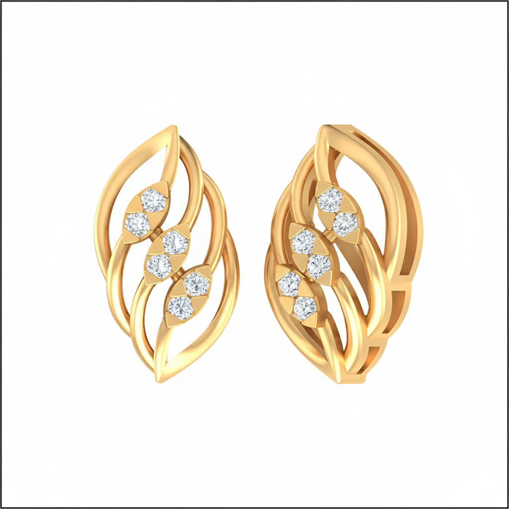 These stunning stud earrings feature a beautiful, layered design inspired by the gentle flow of leaves or petals. Crafted in polished gold, the earrings showcase three gracefully intertwined, marquise-shaped bands, creating an airy and dimensional effect. Along the center, four brilliant round-cut diamonds are meticulously set to add a sparkling focal point that enhances the organic shape. These studs are perfect for women who appreciate nature-inspired elegance and a design that offers both substance and a delicate, flowing silhouette.