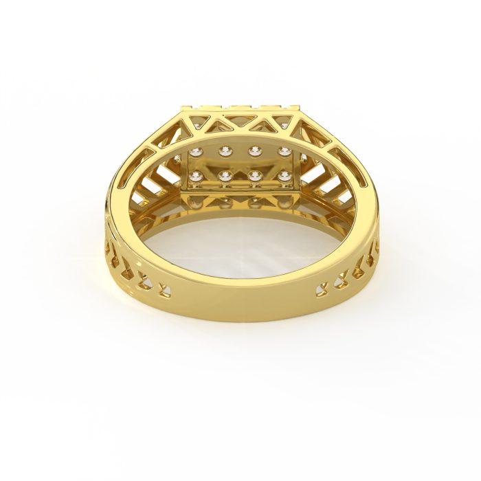 Make a powerful impression with the Majestic Valor Diamond Gents Ring by Tritiya Gold and Diamonds. Featuring a striking checkerboard diamond pattern at its center, this ring is flanked by a bold cut-out arrow design along the band, symbolizing strength and forward momentum. A perfect blend of tradition and contemporary flair.