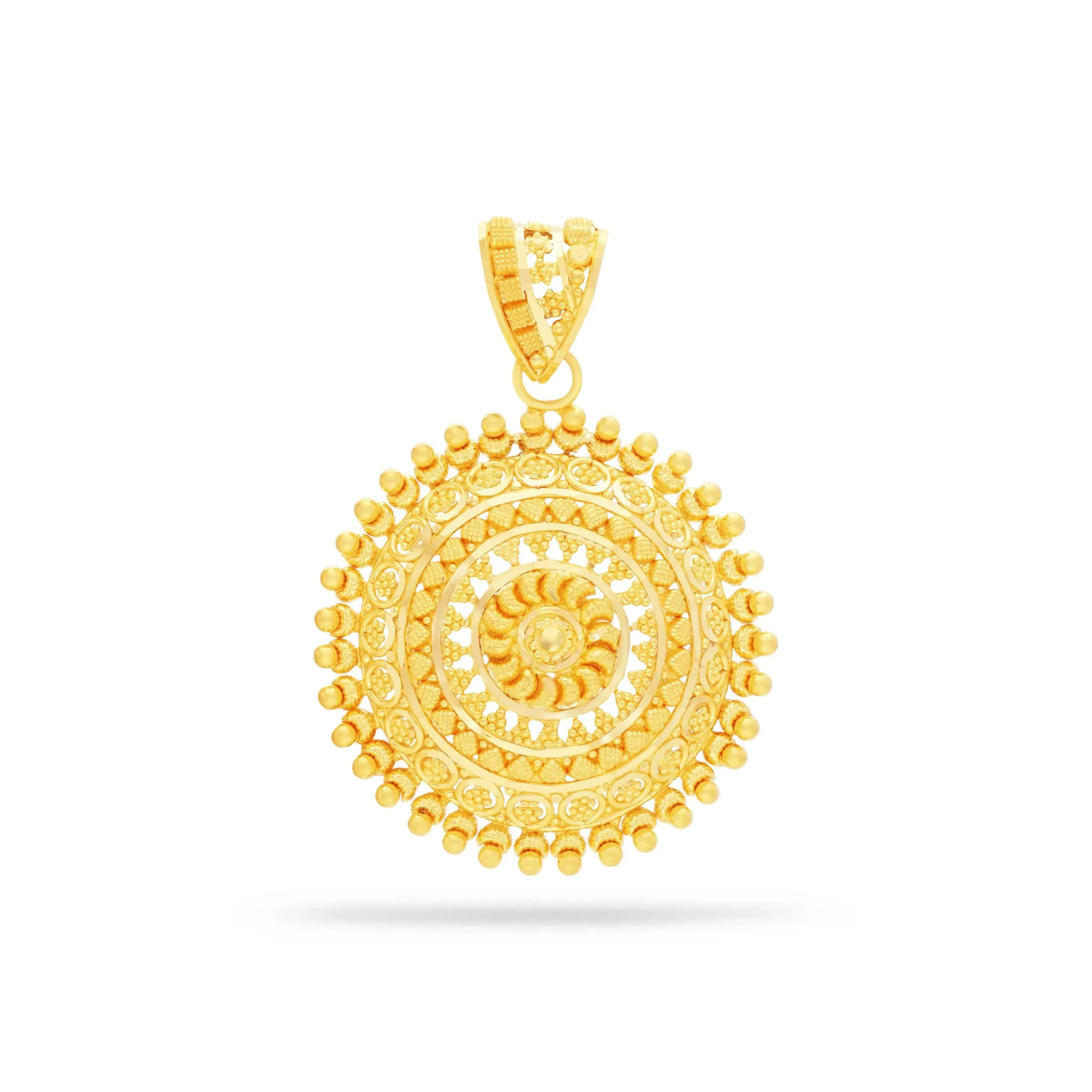 Adorn yourself with the timeless beauty of the Marigold Mandala Gold Pendant. This spectacular piece showcases a rich, circular design inspired by traditional mandala or filigree artistry and is evocative of a blooming marigold flower. The pendant features concentric rings of exquisite detail, including delicate granulation work (small gold beads) along the outer edge and intricate jali (netted) patterns in the center. Crafted in warm yellow gold, this statement pendant is perfect for grand celebrations, festive occasions, or for those who appreciate classic, elaborate Indian jewelry craftsmanship.