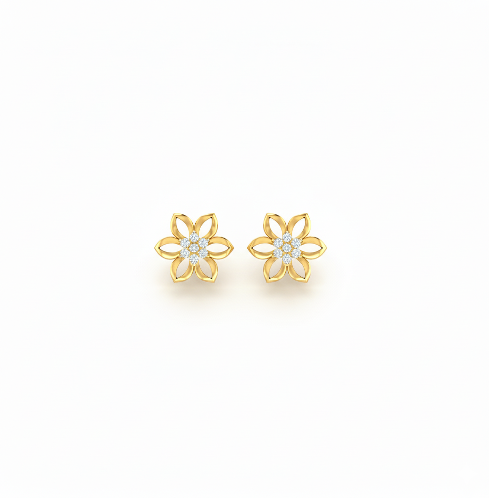 These delightful Open Petal Diamond Flower Studs capture the essence of a delicate bloom with a sophisticated, contemporary twist. Crafted in radiant Rose Gold, the design features six beautifully curved, open petals that form a graceful floral silhouette. The center of the flower is adorned with a cluster of brilliant round diamonds, securely set to maximize their sparkle. The airy, open-work structure makes these earrings lightweight and comfortable, offering a chic, feminine shimmer perfect for adding a touch of romance to everyday wear or a subtle glimmer for a special event.
