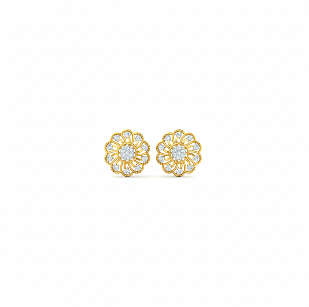 These enchanting Petal Diamond Cluster Studs bloom with delicate beauty and radiant sparkle. Crafted in warm Rose Gold, each earring features a charming flower-inspired silhouette with a scalloped, almost petal-like outer edge. The center of the stud is a dazzling cluster of brilliant round diamonds, designed to catch the light from every angle. Surrounding this central brilliance, additional diamonds are meticulously set along the inner curves of the rose gold petals, enhancing their floral elegance. These earrings are a timeless choice, perfect for adding a touch of feminine glamour to both everyday wear and special occasions.