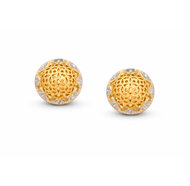 Gracefully crafted with intricate detailing, these Radiant Bloom Two-Tone Gold Stud Earrings showcase a beautifully carved floral pattern at the center, framed with elegant white-gold textured accents along the border. The harmonious blend of yellow and white gold tones enhances the depth and brilliance of the design, giving it a refined and sophisticated appeal.