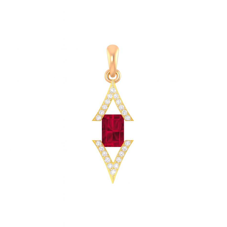 Exuding royal charm, this pendant features a striking emerald-cut ruby at its center, framed by sparkling white diamonds in an artistic geometric design. Crafted in rose gold with diamond accents, it blends bold elegance with timeless sophistication, making it a standout addition to any jewelry collection.