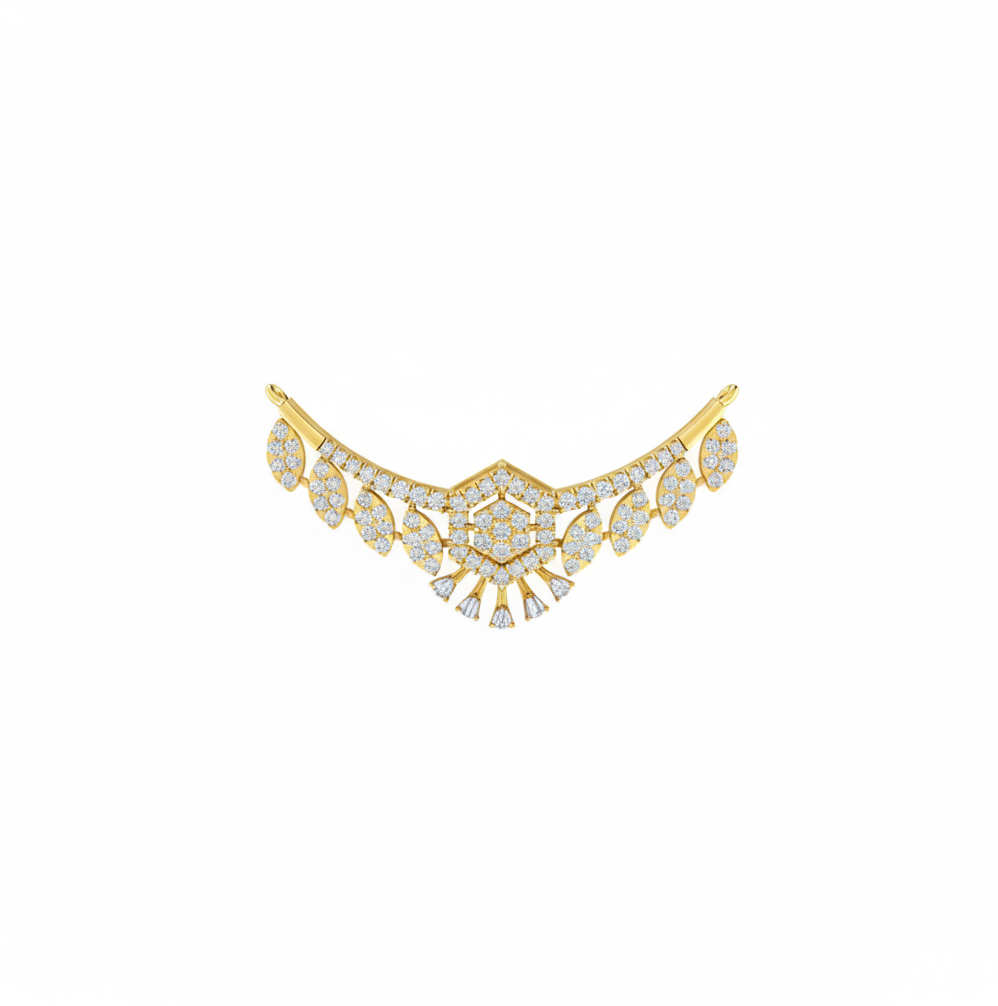 The Regal V-Line Diamond Mangalsutra is a truly majestic and contemporary interpretation of traditional jewelry. This stunning piece is designed with an elegant, sweeping V-shape that sits beautifully on the neckline. The central feature is an intricate hexagonal cluster of brilliant diamonds, creating a magnificent focal point. Flanking the center are delicate rows and brilliant marquise-shaped diamond clusters, all set in a lovely rose gold-toned metal. This bold yet refined design is perfect for the woman who desires a glamorous, substantial piece that beautifully honors tradition.