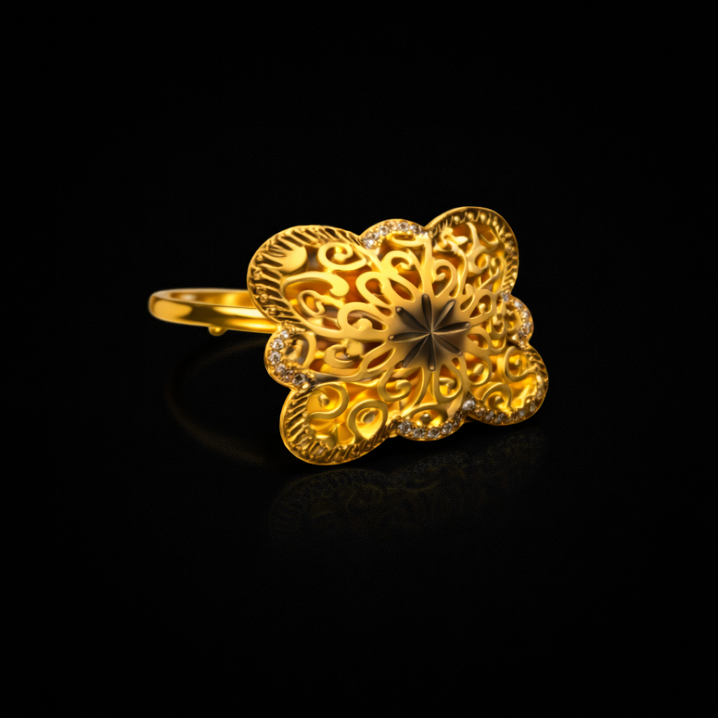 A finely carved star-like motif at the center adds dimension, and subtle sparkling stone accents along select curves bring a refined touch of brilliance. Designed in radiant yellow gold, this ring beautifully blends traditional craftsmanship with modern elegance. Perfect for festive occasions, weddings, and statement ethnic styling, this piece is both eye-catching and comfortable to wear.
