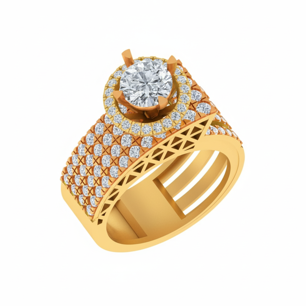 The Royal Radiance Diamond Cluster Ring is a breathtaking statement piece designed for unparalleled brilliance and glamour. Masterfully crafted in lustrous yellow gold, this ring features a spectacular central round-cut diamond encircled by a sparkling halo of smaller diamonds, maximizing its visible size and fire. The wide, architectural band is meticulously pavé-set with multiple rows of dazzling diamonds and accented with intricate latticework on the sides, creating a truly magnificent and luxurious aesthetic. It is an ideal choice for an engagement ring, a wedding band, or a significant anniversary gift.