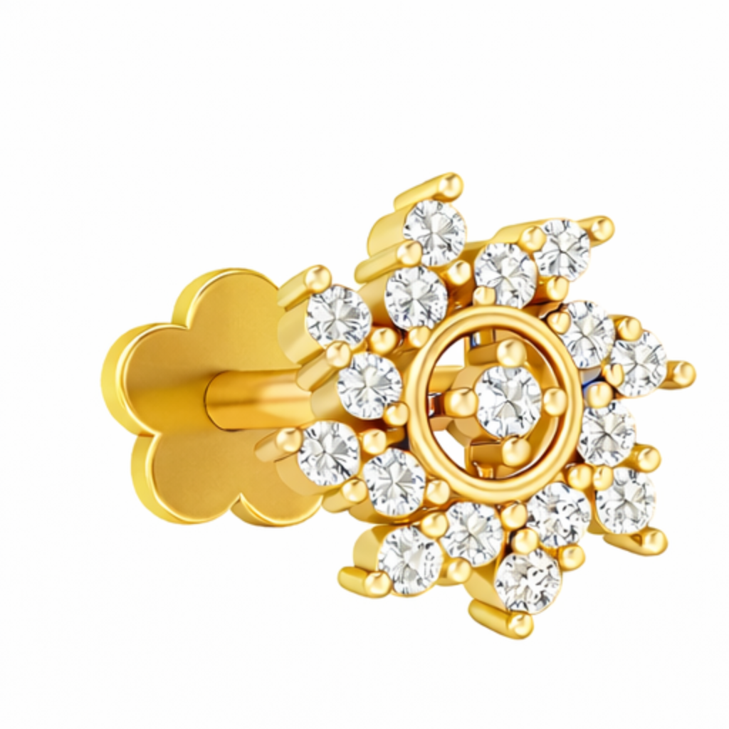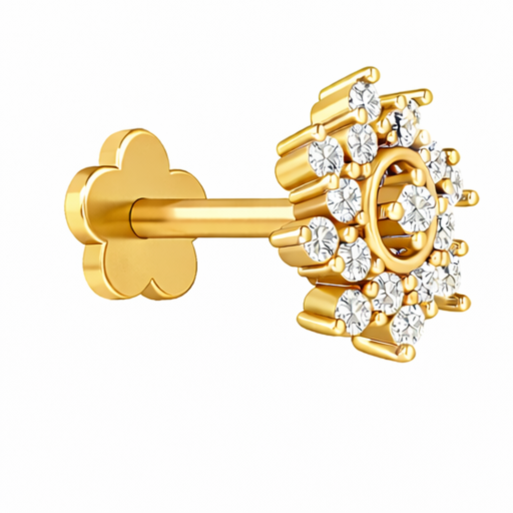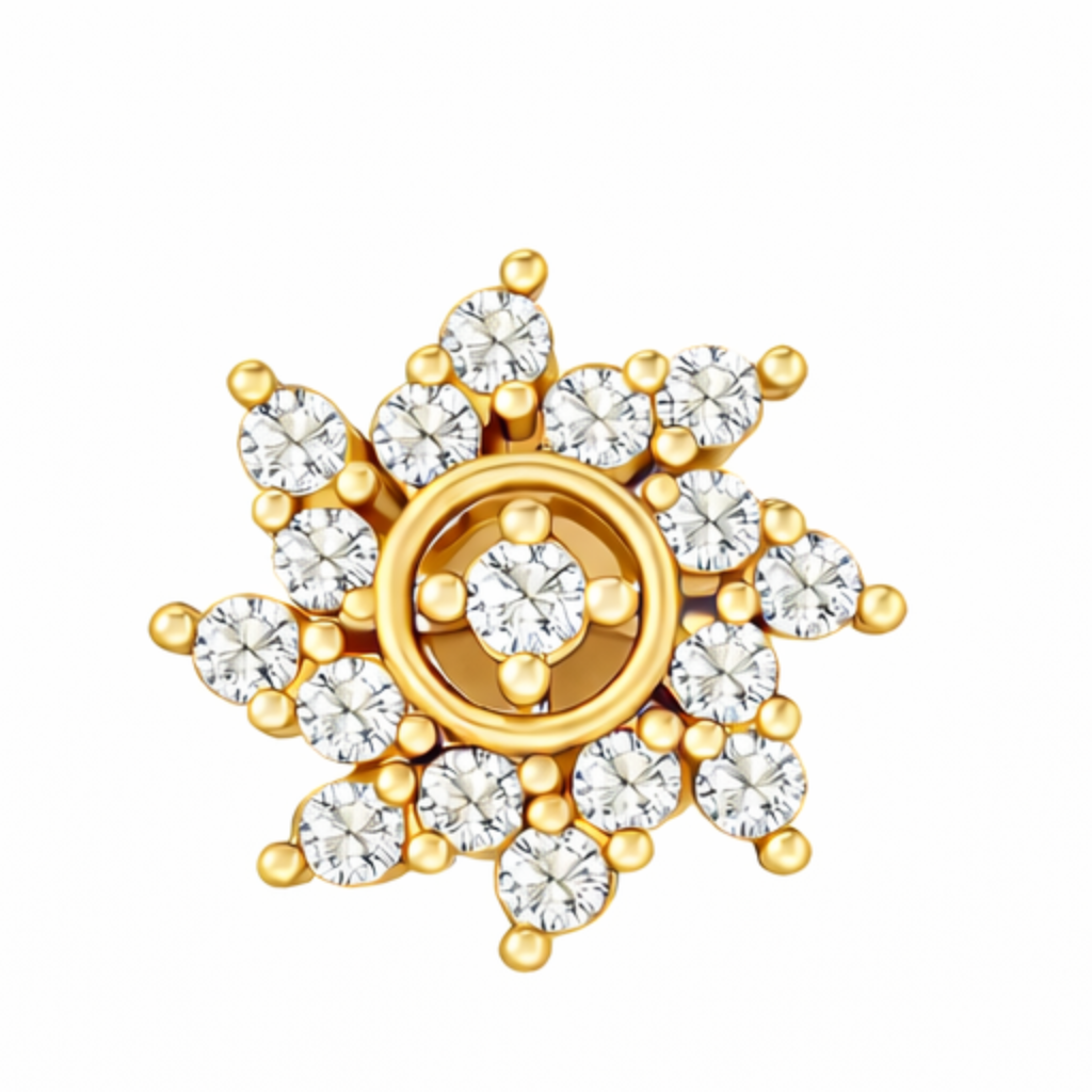 A dazzling design inspired by the brilliance of the sun, this diamond nose pin features a radiant center diamond encircled by a sparkling halo of diamonds that create a beautiful sunburst effect. Crafted in classic yellow gold with white gold prongs for enhanced brilliance, this piece offers a perfect blend of traditional charm and modern sparkle. Lightweight and elegant, it is ideal for everyday wear while adding a refined touch of luxury to your look. ✨