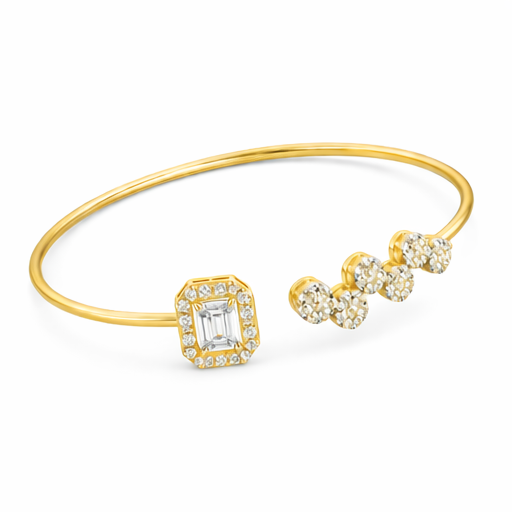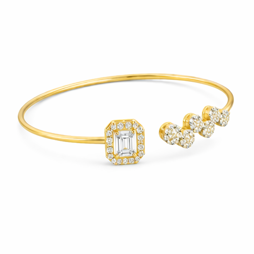 The Royale Asymmetry Diamond Open Kada is a unique blend of modern artistry and timeless sparkle. Crafted in fine gold, this elegant open bracelet features an emerald-shaped diamond motif with baguette and round diamonds on one side, while the other side is adorned with a graceful row of round diamond clusters. The asymmetrical design gives it a stylish and contemporary appeal, perfect for those who love distinctive yet sophisticated jewelry. Lightweight and versatile, it is ideal for both everyday luxury and special occasions.