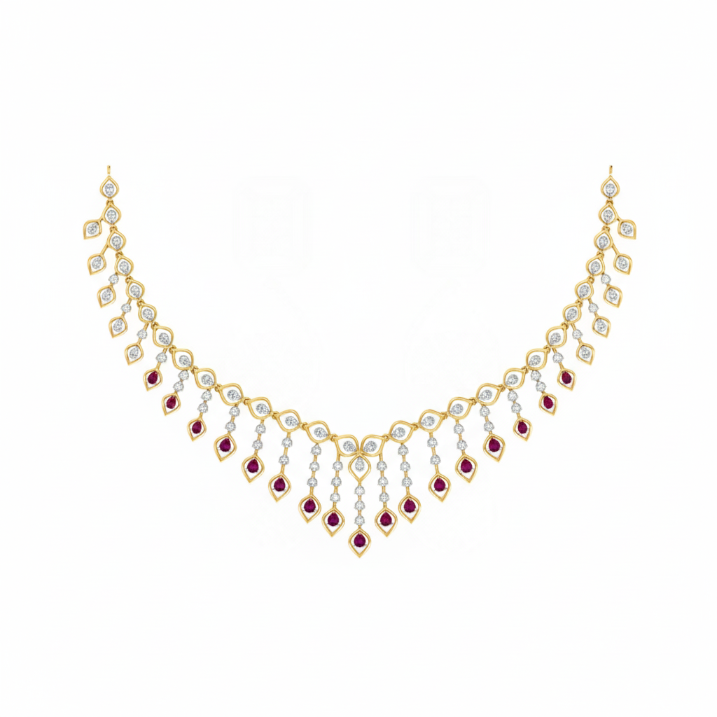 The Ruby Dewdrop Diamond Collar Necklace is a majestic piece that exudes regal charm and vibrant color. Crafted in a warm Rose Gold base, the necklace features an elegant, continuous chain of alternating diamond-studded marquise motifs and open circular links. The spectacular drop design showcases multiple dangling pear-cut rubies interspersed with brilliant diamond drops, creating a graceful, rhythmic cascade along the neckline. This elaborate and highly detailed necklace is a true heirloom piece, perfect for making an unforgettable statement at any grand wedding or formal celebration.