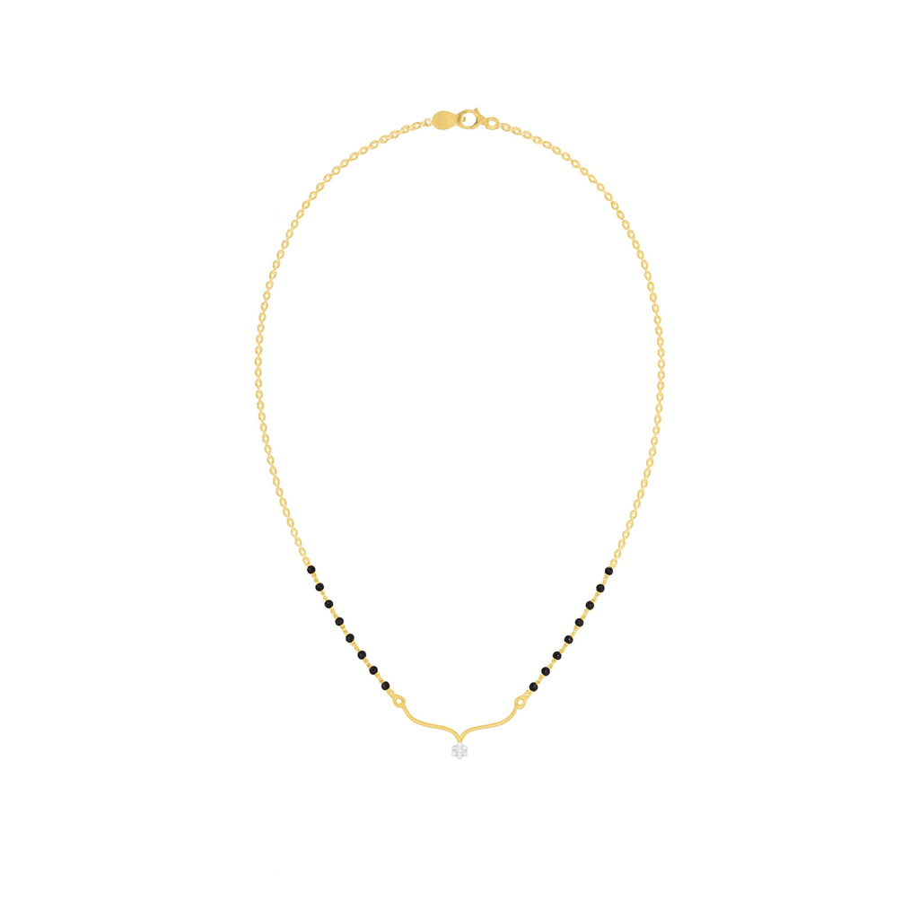 The Solitaire Glow Diamond Mangalsutra is a minimal yet radiant symbol of eternal love. Crafted in 18KT and 14KT gold, it features a delicate chain with black beads and a single solitaire diamond pendant at the center, reflecting purity, strength, and elegance. Its sleek and timeless design makes it perfect for women who prefer a subtle and classy look for daily wear.