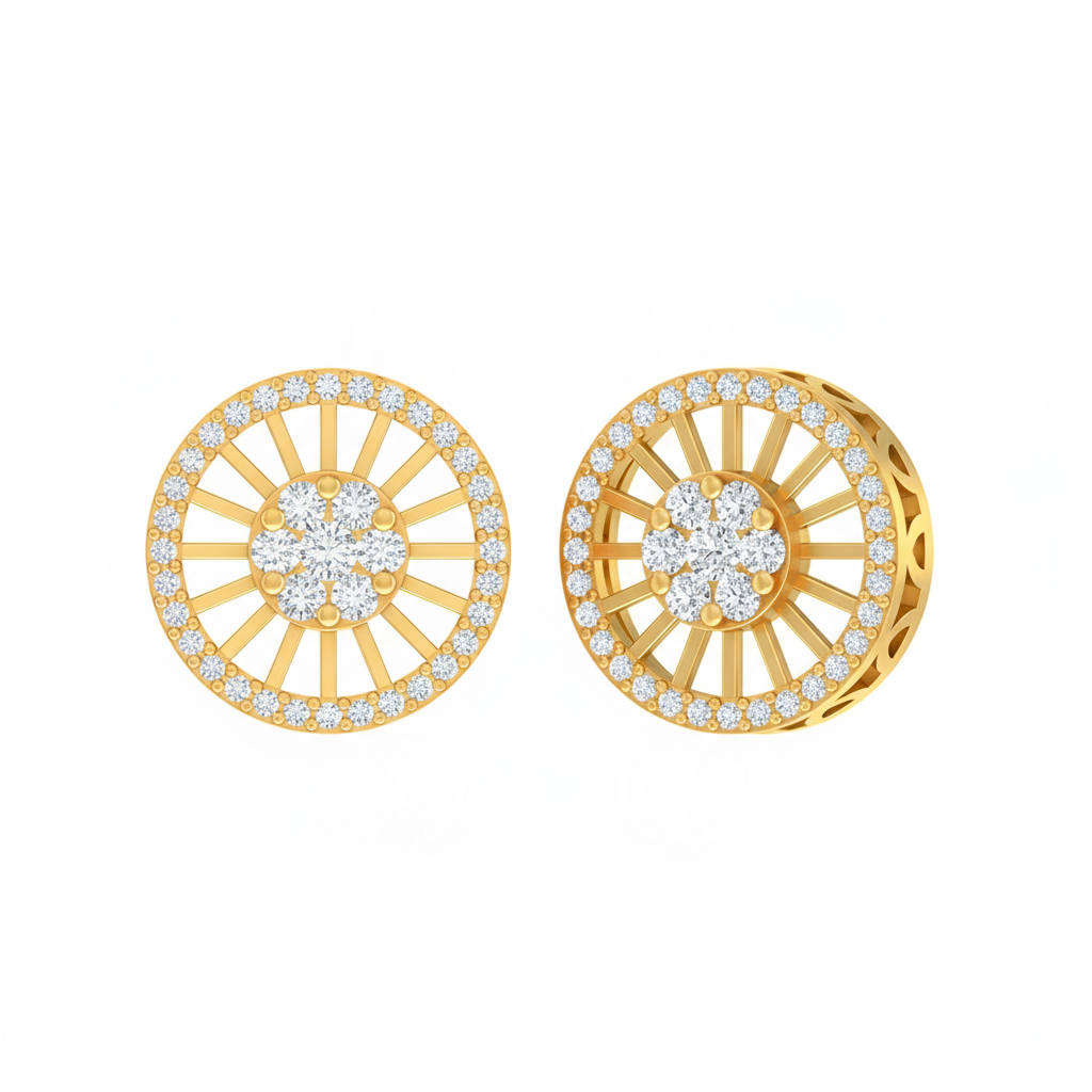 The Sunburst Wheel Diamond Studs are a striking piece of architectural brilliance and contemporary style. Crafted in warm rose gold with contrasting white gold/rhodium accents, the design features a dynamic circular framework that mimics a wheel or sunburst. The polished rose gold ‘spokes’ radiate outward from a magnificent central diamond cluster. This intricate center is encircled by a dazzling pave-set diamond border, creating a high-impact, dimensional look perfect for the woman who loves bold geometry and intense sparkle.