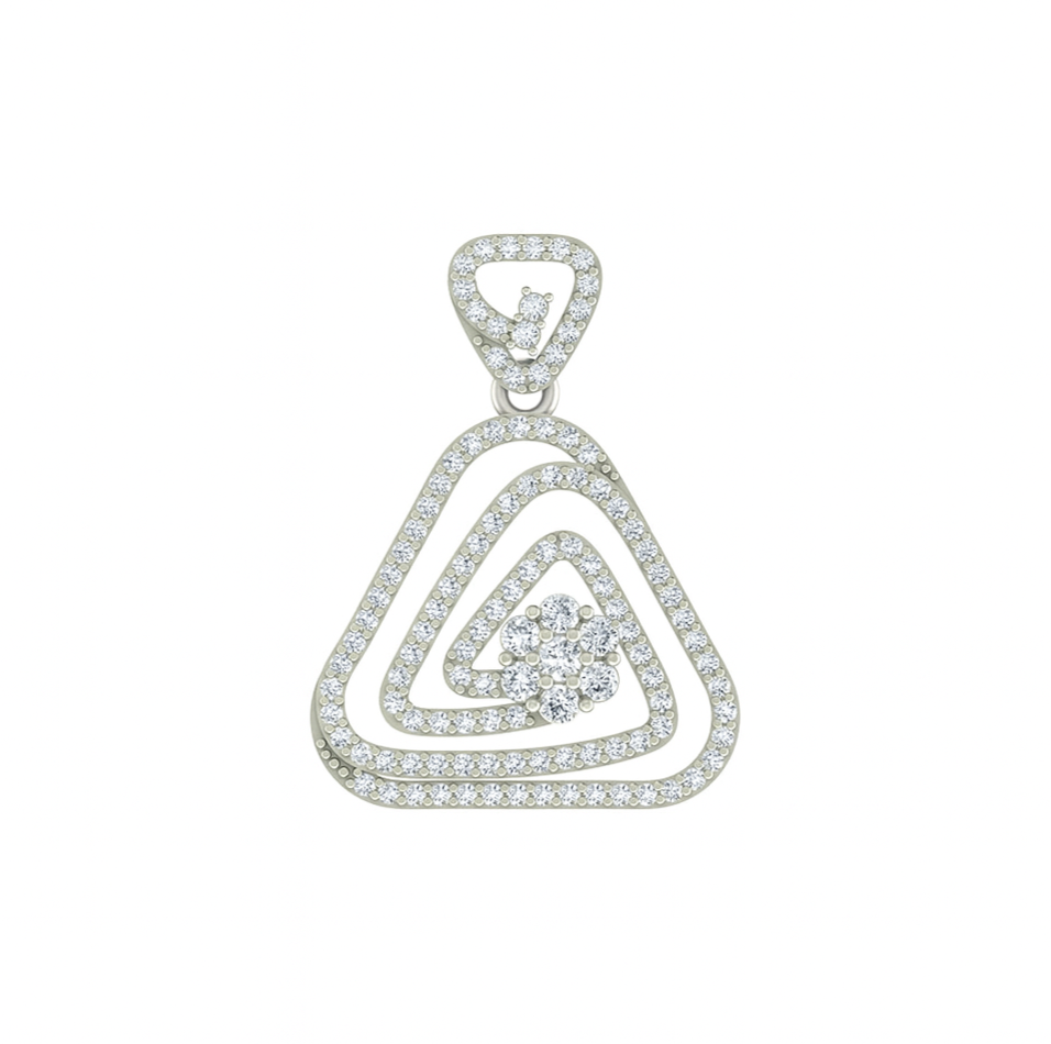 Modern and elegant, this pendant features a unique layered triangular design, fully encrusted with shimmering white diamonds. At the center rests a floral diamond cluster, adding a delicate touch of charm to the bold geometric style. A perfect blend of contemporary artistry and timeless sparkle.