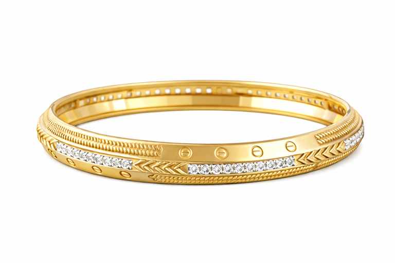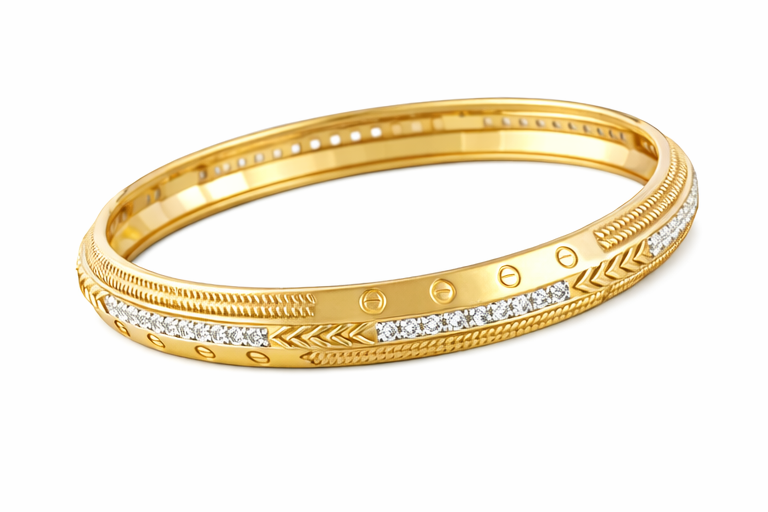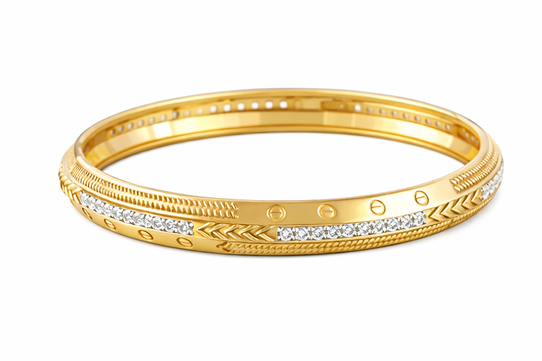 Its balanced combination of polished gold, detailed craftsmanship, and diamond brilliance makes it ideal for those who appreciate sophisticated statement jewellery. Built with a secure clasp and comfort fit design, this kada is suitable for everyday luxury as well as special occasions.