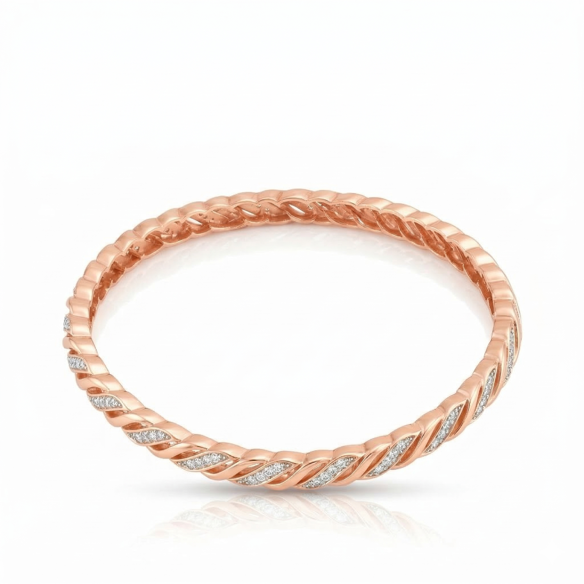 A stylish twisted diamond rose gold bangle featuring an elegant braided pattern with sparkling diamond accents set along the curves. The sleek and modern design adds a touch of sophistication, making it perfect for both everyday elegance and special occasions.