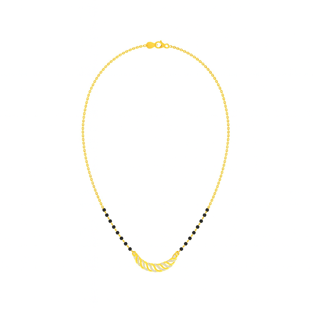 The Twisted Elegance Diamond Mangalsutra is a modern masterpiece that beautifully symbolizes love and togetherness. Crafted in 18KT and 14KT gold, it features a delicate chain with traditional black beads and a uniquely twisted pendant design. Its sleek curves and minimalistic charm make it the perfect choice for women who love elegance with a contemporary touch.