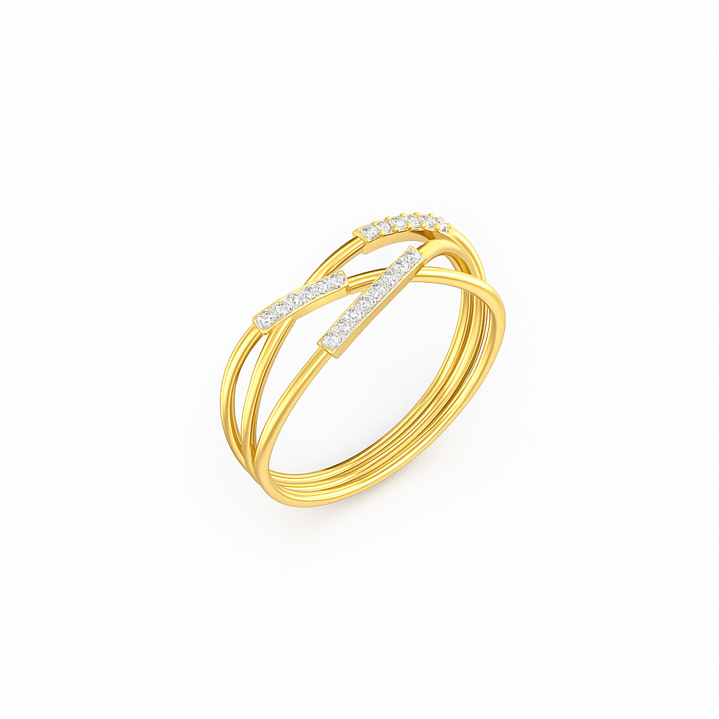 The Zenith Crossing Diamond Ring is a modern masterpiece defined by clean lines and striking geometry. Crafted in polished yellow gold, the design features multiple slender, smooth bands that appear to overlap and intersect elegantly across the finger. Two key bars of gold diagonally cross the surface, each micro-pavé set with brilliant round diamonds. This open-style, fluid design gives the illusion of stacked rings while offering a comfortable, single-piece fit. It’s a chic, contemporary piece ideal for the woman who appreciates minimalist luxury and geometric flair.